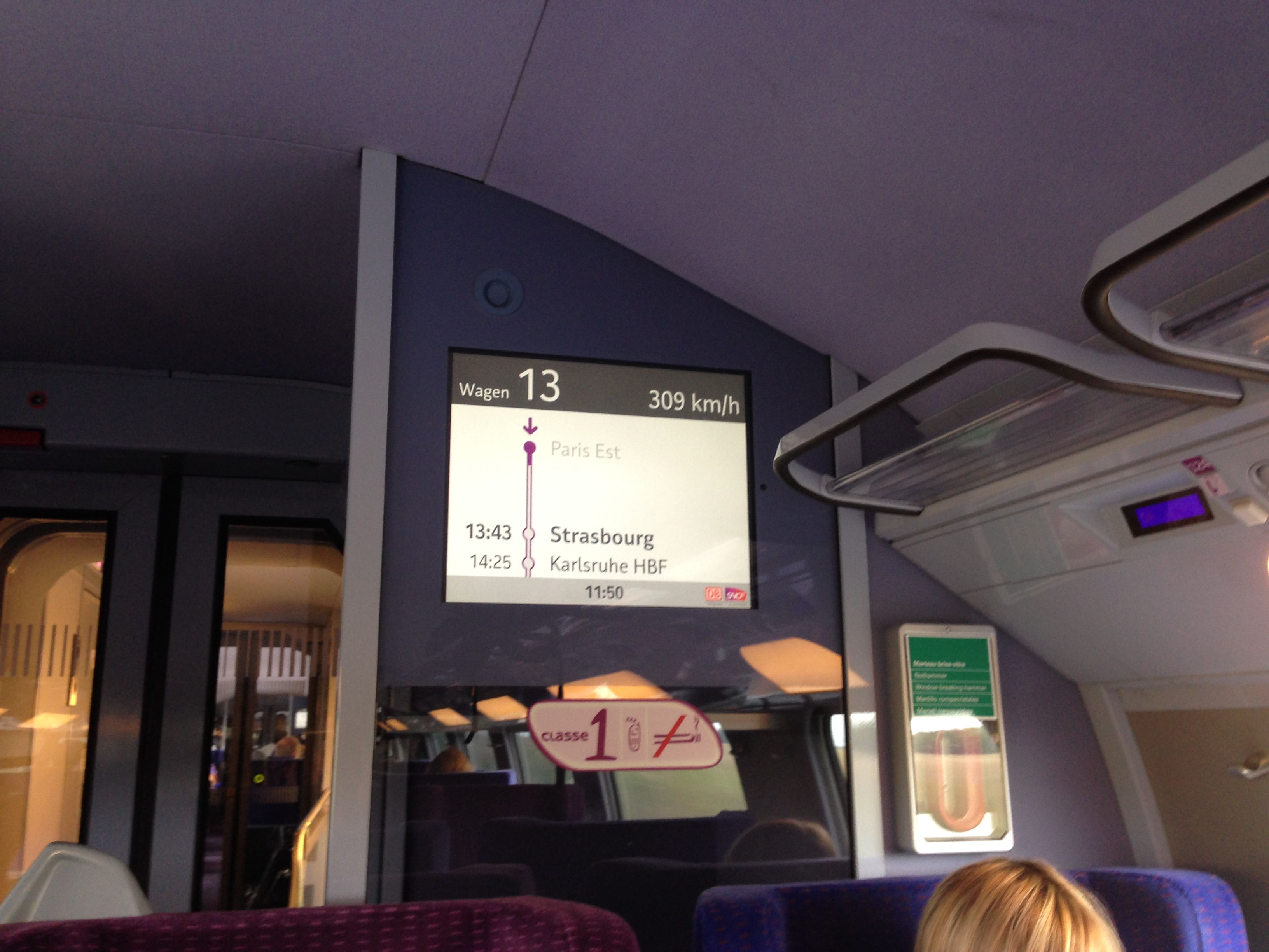 Junan nopeus on ällistyttävä: näytön mukaan olimme parhaimmillaan noin 318km/h vauhdissa. Etenkin Pariisi-Lyon-väli on erittäin sujuva, vain pari tuntia ja samoin Pariisin ja Karlsruhen väli taittuu kolmessa tunnissa. Karlsruhen ja Lyonin väli voisi teoriassa mennä viittä tuntiaan nopeamminkin, mutta tällä välillä on paljon pysähdyksiä. Esim. Pariisi-Karlsruhe -välillä stoppi on vain Strasbourgissa (ja juna jatkaa vielä Stuttgartiin).